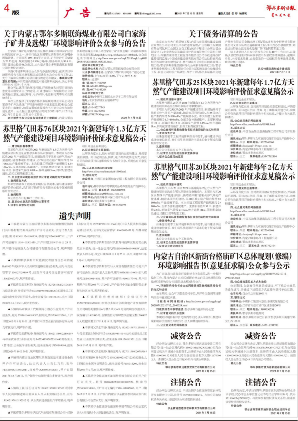 在第二次網絡公示期間,分別在2021年7月15日和2021年7月19日在鄂爾多斯日報報紙上進行了兩次登報公示,每次公示時間為5個工作日,報紙公示截圖詳見下圖。
